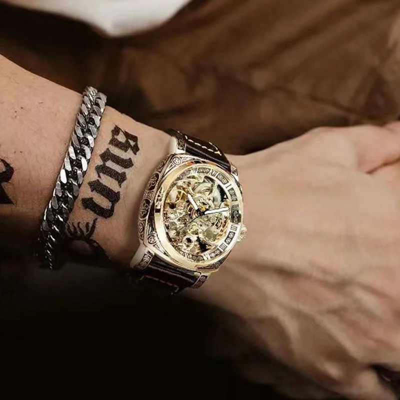 Black Alloy Carved Fully Tourbillon Hollow Mechanical Watch